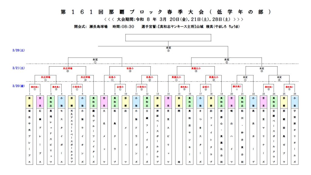 那覇ブロック春季大会-抽選会 開催日: 2026年3月1日 17:00 - 18:00集 合: 16: 00会 場: 垣花小学校 体育館マップ: 参加者 崎濱 崎濱は「那覇ブロック審判部長」としての参加となります 「真和志地区審判部長」として金城が出席できない時は、代理を立てる努力をお願いします 抽選結果 高学年 低学年